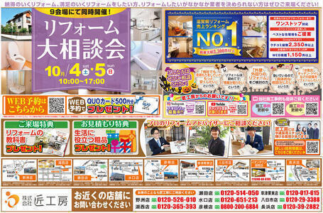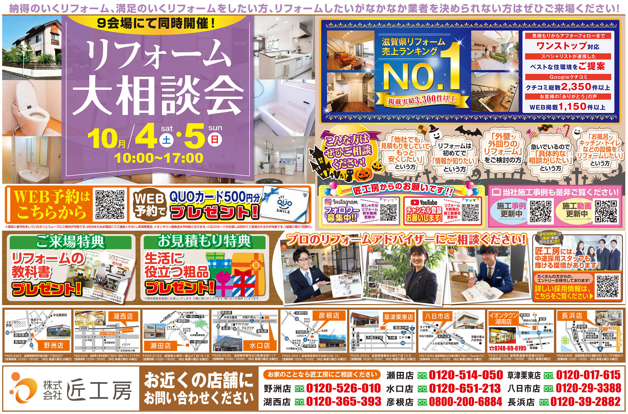 匠工房 野洲店・湖西店・水口店・瀬田店・彦根店・草津栗東店・八日市店・イオンタウン湖南店・長浜店の9会場にて同時開催!!
