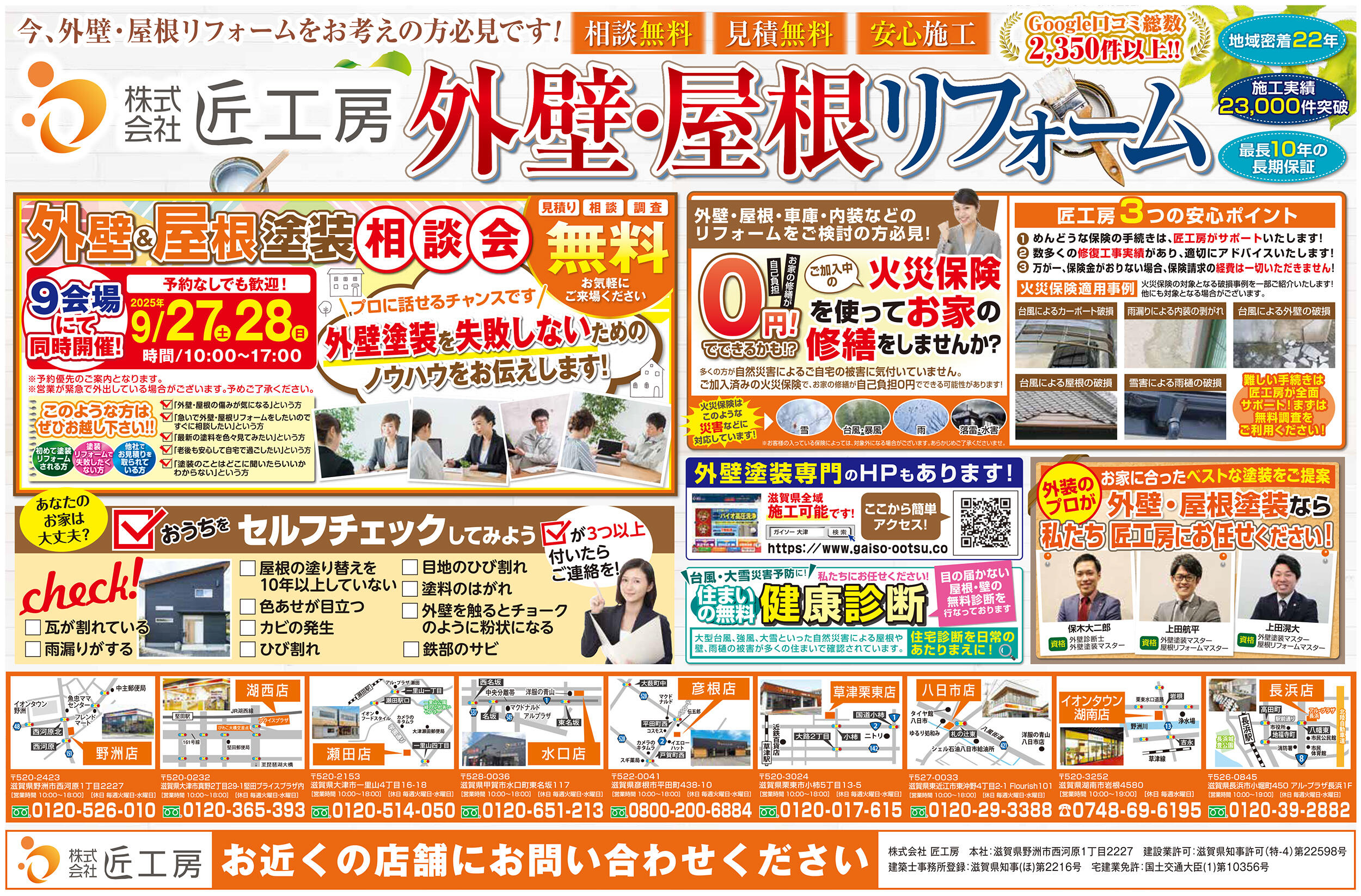 匠工房 野洲店・湖西店・水口店・瀬田店・彦根店・草津栗東店・八日市店・イオンタウン湖南店・長浜店の9会場にて同時開催!!
