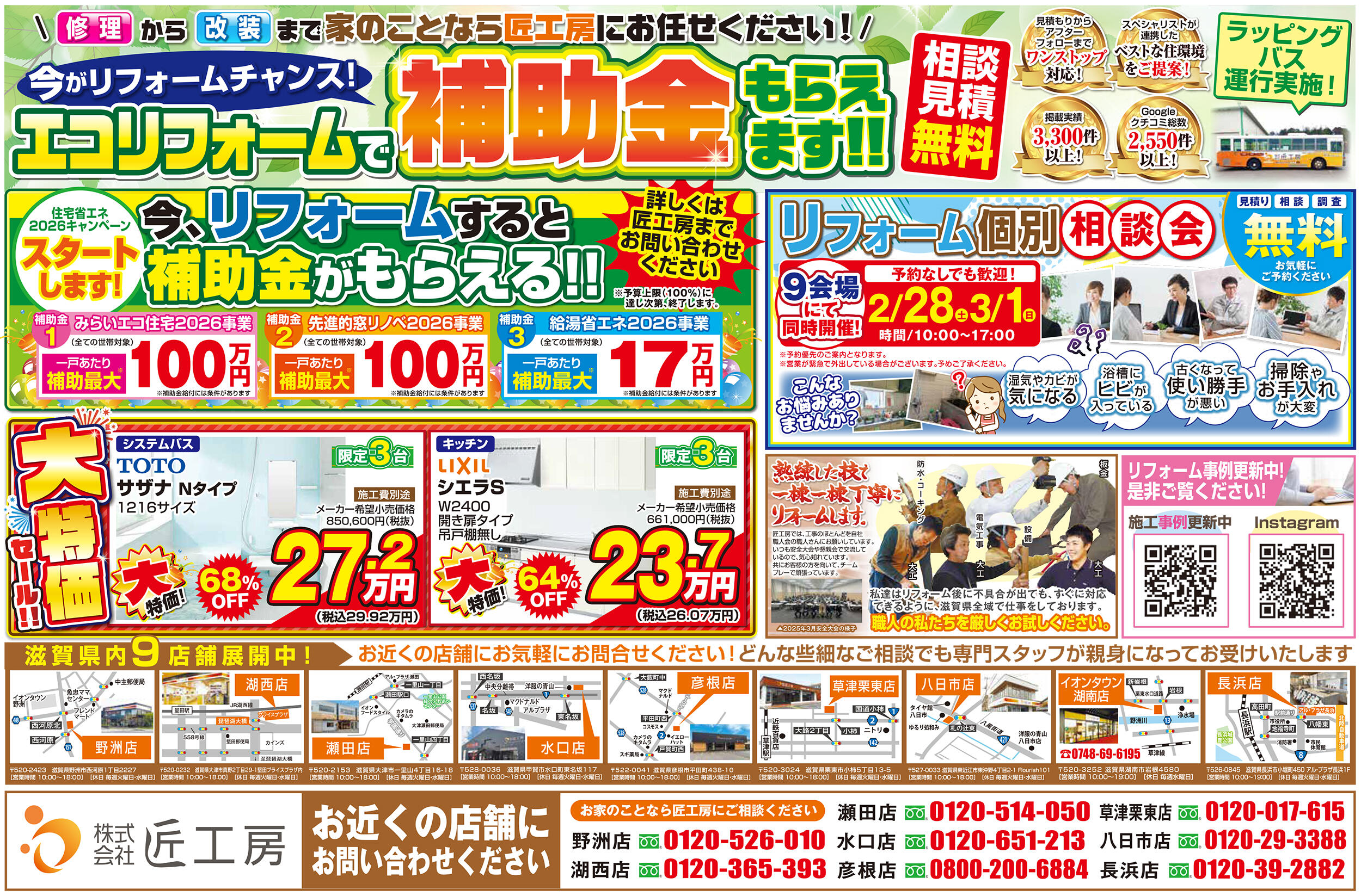匠工房 野洲店・湖西店・水口店・瀬田店・彦根店・草津栗東店・八日市店・イオンタウン湖南店・長浜店の9会場にて同時開催!!