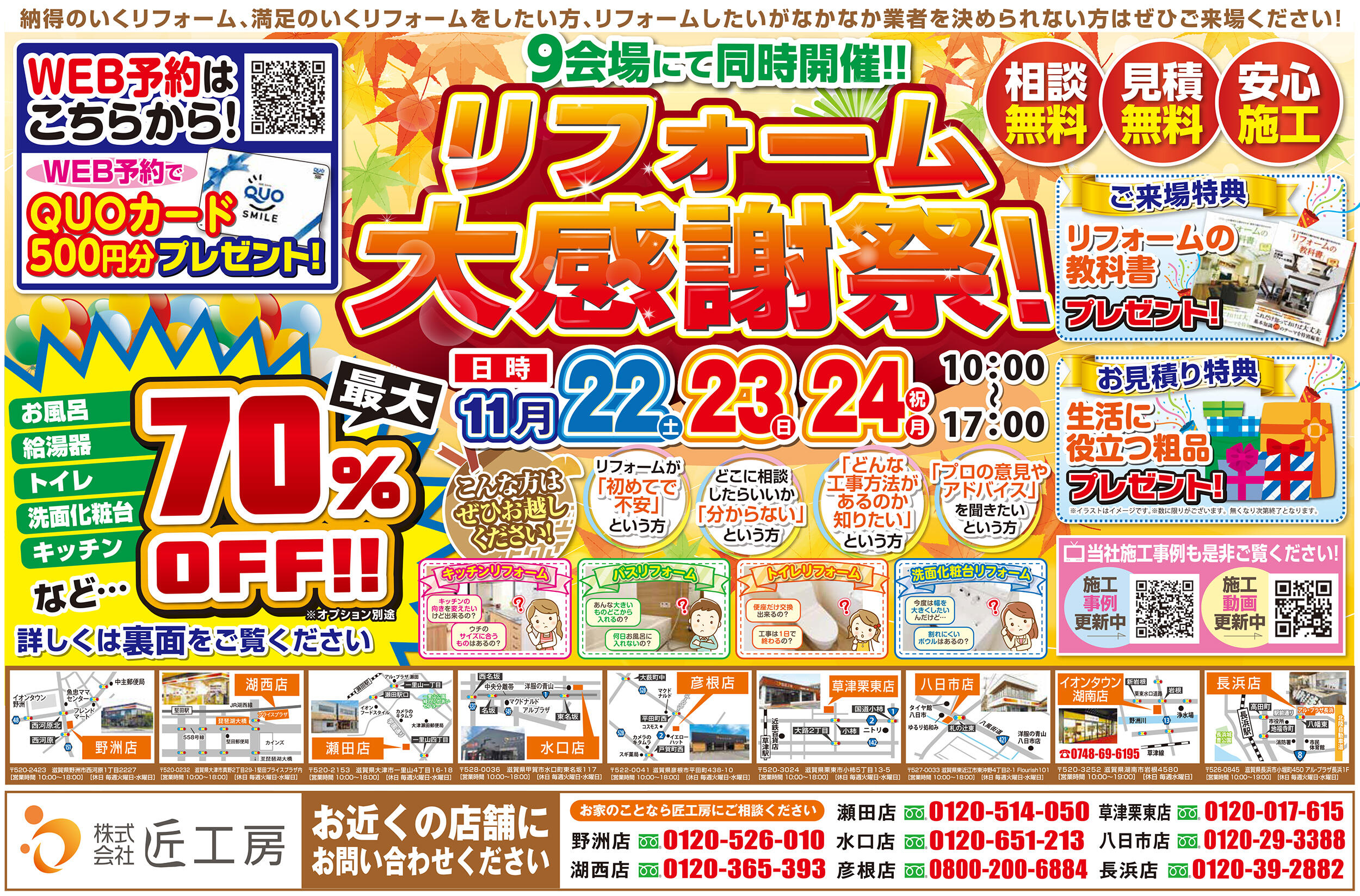匠工房 野洲店・湖西店・水口店・瀬田店・彦根店・草津栗東店・八日市店・イオンタウン湖南店・長浜店の9会場にて同時開催!!