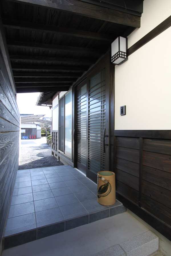 外観は腰までを杉板の鎧張りにし、上部に漆喰をぬり重厚感を演出。