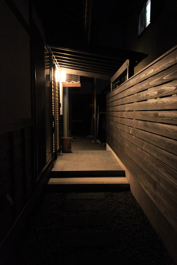 離れの和室2間をLDKに。廊下にお風呂、洗面所。 別棟に寝室を作り、連絡通路にトイレを設けるという大規模リフォームです。 外観は腰までを杉板の鎧張りにし、上部に漆喰をぬり重厚感を演出。 もともとの建物のイメージを余り崩さないように意識しました。 内部のデザインは外部の和に調和するよう、落ち着いたウォルナット色をベースに 和と洋のバランスを重視しプランしました。 遊び心で作ったキッチンから畳コーナーの建具が、 デザイン的にも機能的にも大きな効果を発揮しました。
