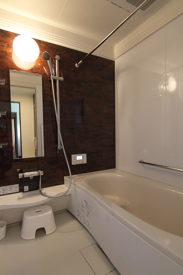 離れに新しくお風呂を作りました。洗面台は天井まである収納も兼ねています。