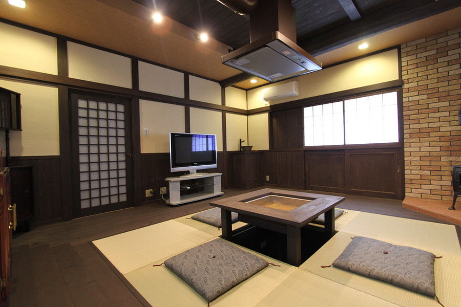 琉球畳に薪ストーブ、囲炉裏に梁...すべてが入り混じって、でも統一感のある素敵な空間になりました。