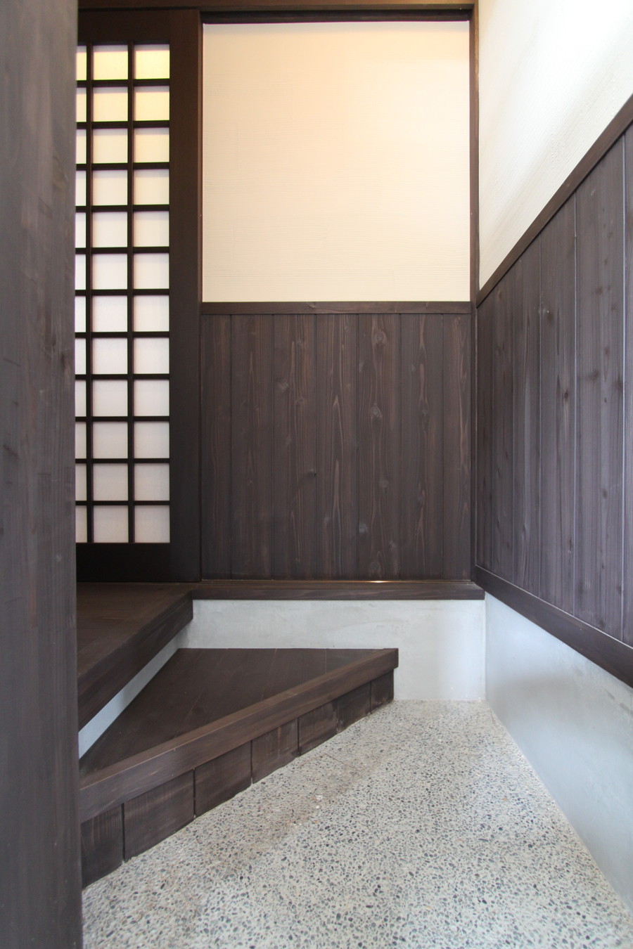 囲炉裏を作って下さい。そして、薪ストーブもほしい。 このふたつの文化(和と洋)が入り混じる空間にどちらを強調させるか迷いましたが、 基本的には和室ベースでリフォームさせて頂きました。 解体してでてきた構造材を、できる限り協調させるように塗装を施し、梁・腰板・床・壁・天井・設備・・・ 空間全体の色の配色にも気を配りました。 間取りは変更していませんが、動線計画を配慮して、来客の場合には 外から直接入っていただける様に小さい入り口を設けました。
