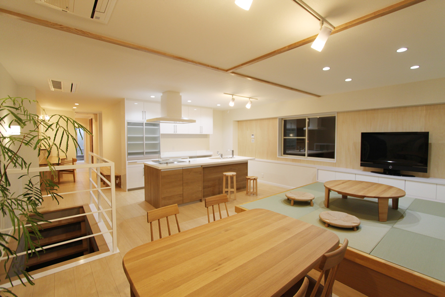 生活の中心となるLDKは白を基調として明るく、収納スペースは畳コーナーの床高を使って収納できる引き出し付。