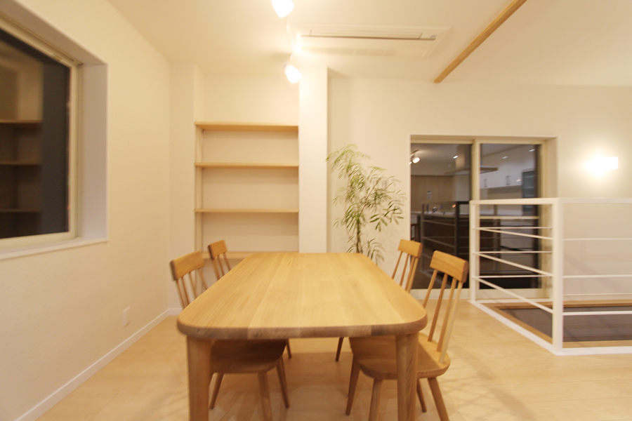 タモの集成材をつかった書棚兼用ベンチもポイントです。