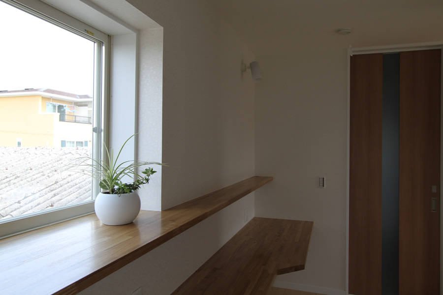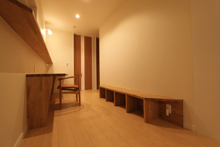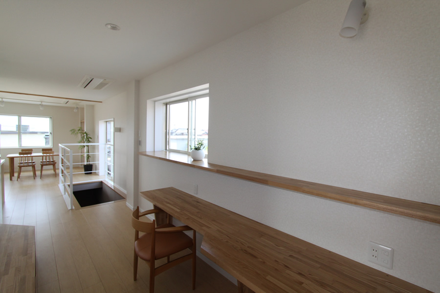 通路に、デスクコーナーを設けました。デスクコーナーは、家族みんなの書斎スペース。