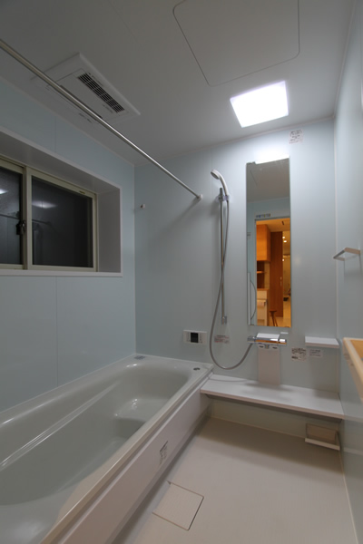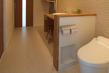 化粧室は、洗面・トイレ・洗濯の場としてひとつにまとめることでコストを抑えました。