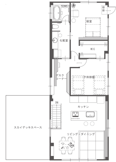 生活の中心となるLDKは白を基調として明るく、スカイデッキも楽しめる要素のひとつ
