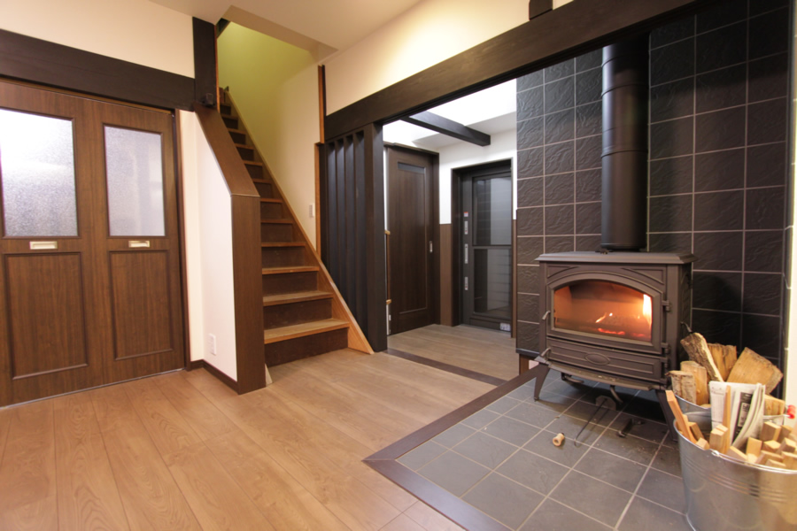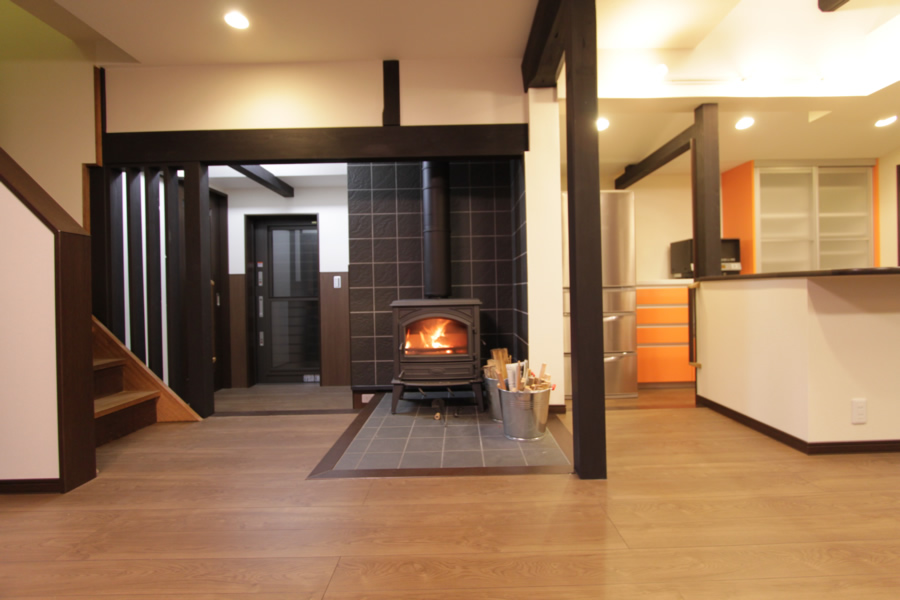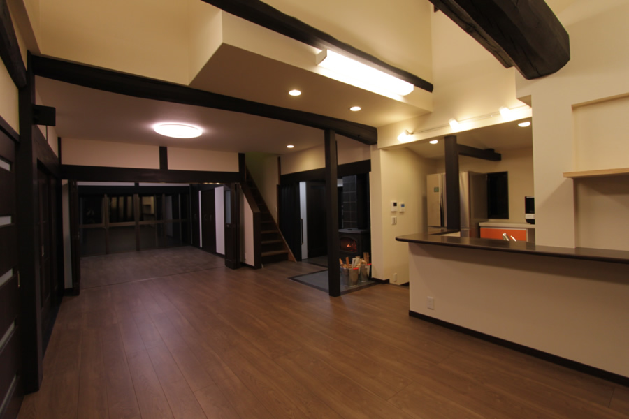 耐震補強については、床レベルを合わせたり、天井材を交換する目的もあって、床や壁、天井を めくった際に耐震金物で補強しました。必要工事の中で最大限効果を出す方法です。 また、薪ストーブ用の空気の流れを考慮して、物置になっている二階を一部改装し、 大きな吹き抜けを作りました。暖気は上部に上がる性質があるので、 後々利用するであろう吹き抜け空間に隣接する壁に窓を設けて、空気の循環を良くしました。 内装はベージュ系の壁紙で演出し、梁をアクセントで黒のベンガラで塗装して 空間を引き締める効果を出しました。