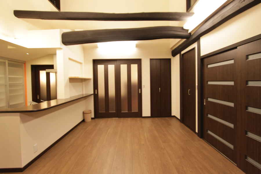 内装はベージュ系の壁紙で演出し、梁をアクセントで黒のベンガラで塗装して空間を引き締める効果を出しました。
