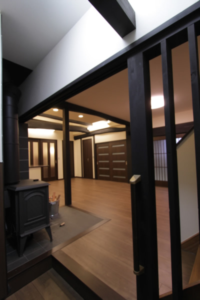 耐震補強については、床レベルを合わせたり、天井材を交換する目的もあって、床や壁、天井を めくった際に耐震金物で補強しました。必要工事の中で最大限効果を出す方法です。 また、薪ストーブ用の空気の流れを考慮して、物置になっている二階を一部改装し、 大きな吹き抜けを作りました。暖気は上部に上がる性質があるので、 後々利用するであろう吹き抜け空間に隣接する壁に窓を設けて、空気の循環を良くしました。 内装はベージュ系の壁紙で演出し、梁をアクセントで黒のベンガラで塗装して 空間を引き締める効果を出しました。