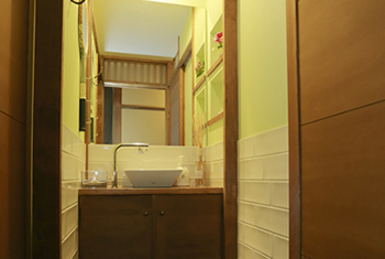 既存の梁・柱・建具・壁・天井仕上を極力利用し、町家の良さを残しつつ