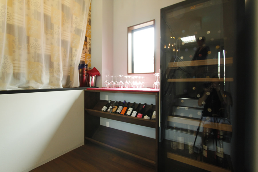 階段の踊り場スペースに、ワインボトルを見やすい角度で置ける家具を造作しました。