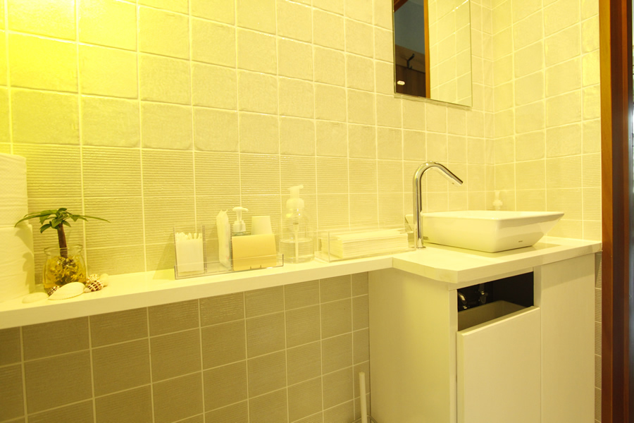 床にフローリング調タイルをランダムにはったり、壁面を黄色の目地にして白いタイルを