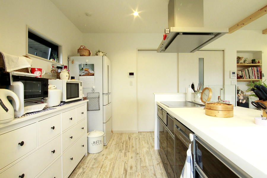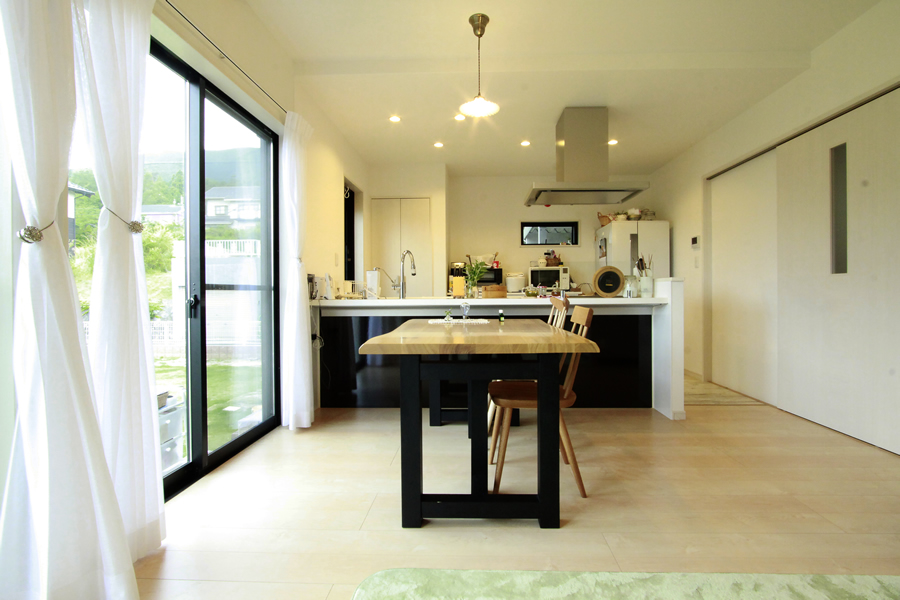 キッチンはアイランド型でLDKに仕切りがないのでひとつながりの空間として一体感が生まれています。