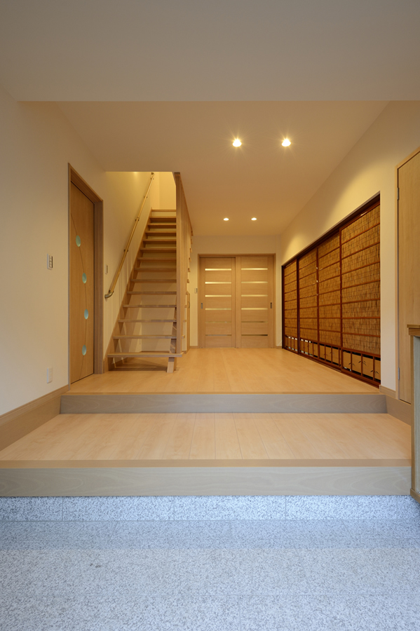 | 広々した玄関、階段の格子と御影石をはり和空間に |