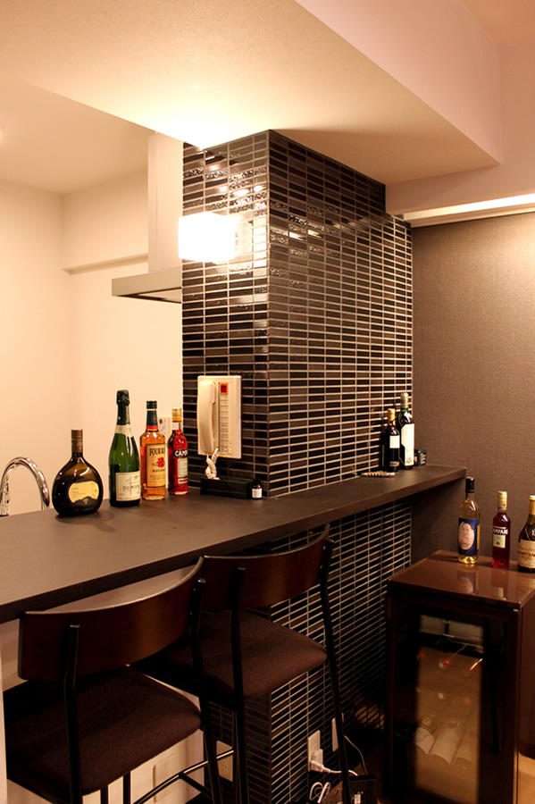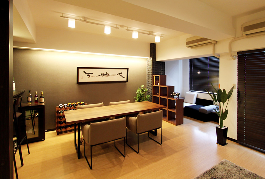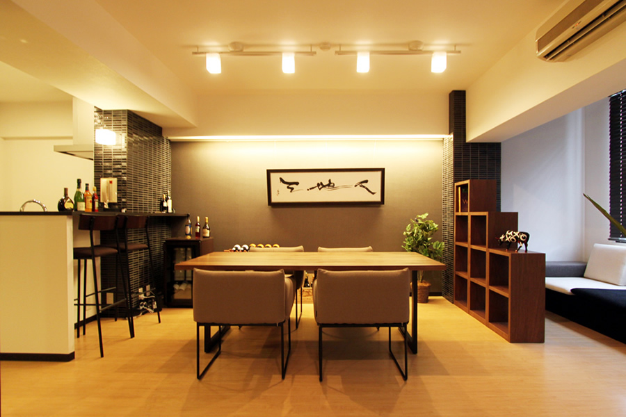 全体的にモノトーン調でワインバーのような落ち着きのある空間に。