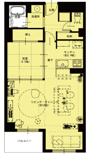 10畳のLD、洋室の間仕切りをなくし、16畳のLDにしました。