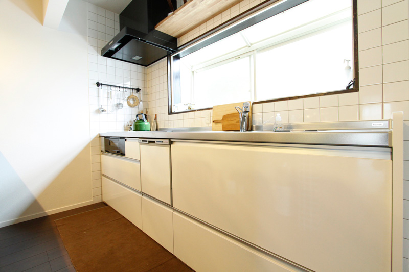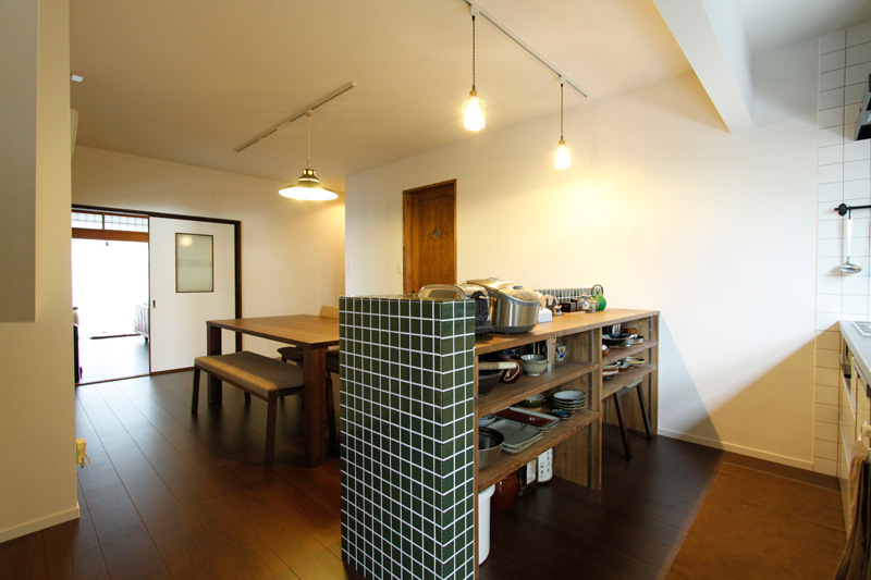 ダークグリーンのタイルで仕上げた対面カウンターの内部は可動棚で使いやすくなっています。