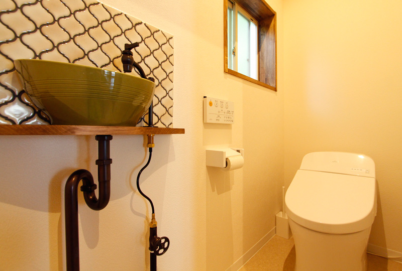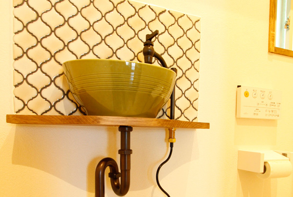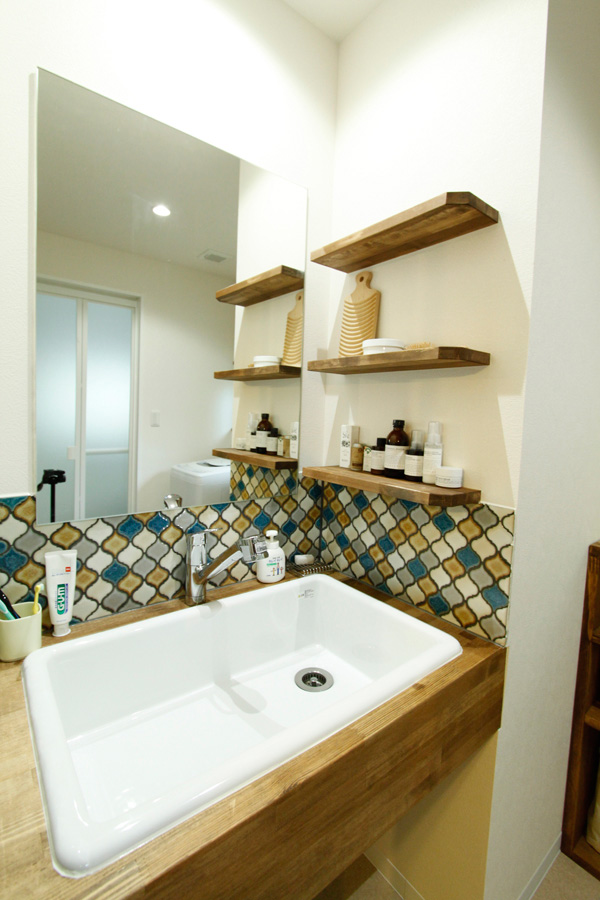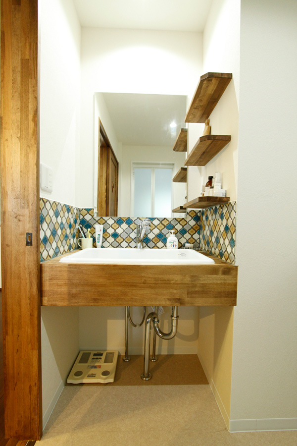 奥様がご用意して下さったおしゃれな洗面台には、モザイクタイルを貼り可愛さを演出しました。