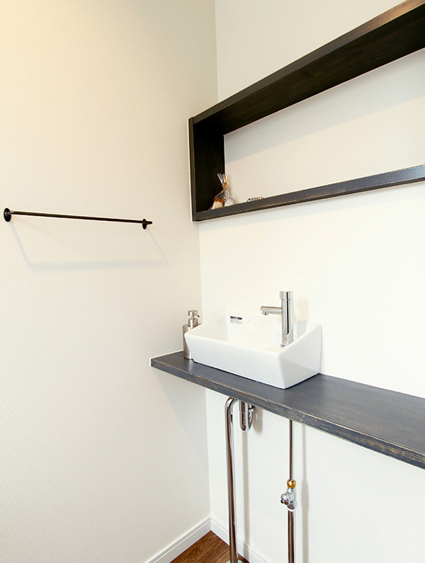 奥様が手を洗いやすいように、 下部がオープンになった手洗いを設けました |