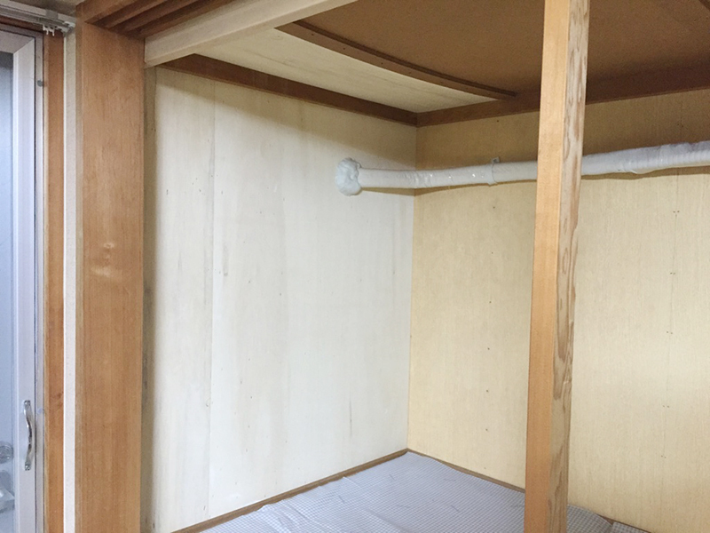 | 工事内容 | 洗面化粧台は撤去し、新しいものに入れ替えました。 クロスは綺麗に張り替える為、エアコンを一度外しクロスを張った後、場所を移設して復旧させました。 押入は、シミ・カビが目立っている部分を隠すため、ベニヤ板を上張りしました。 |