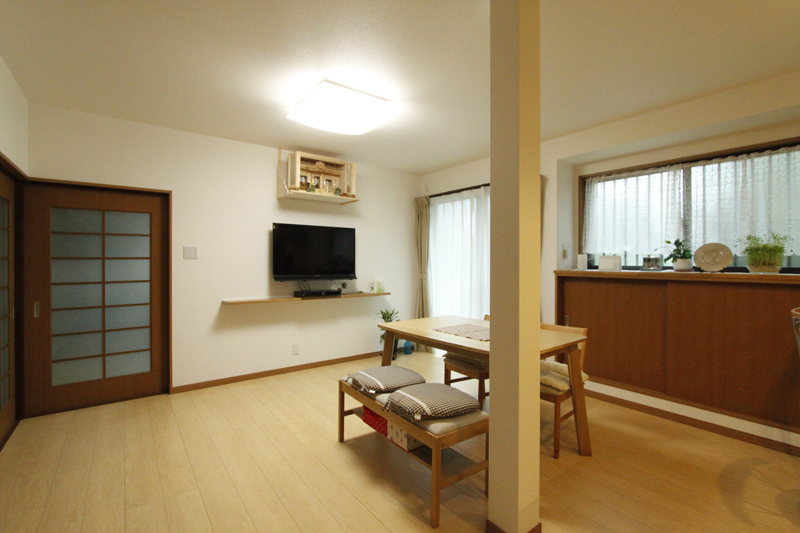 | 工事内容 | タイル張りのお風呂から1616サイズのシステムバスへ交換。ダイニングと横の和室を繋げ、広く快適なLDKへ。 それに合わせてキッチン、カップボード、冷蔵庫、テレビ、エアコンも新調。 キッチンは広いLDKを生かして対面型にしました。部屋の真ん中の柱は構造上重要な柱だったのでそのまま残してクロスを巻きました。 天井と壁は明るく白いクロスでまとめ、キッチンと床の色を合わせてバランスの良い空間に仕上げました。 |