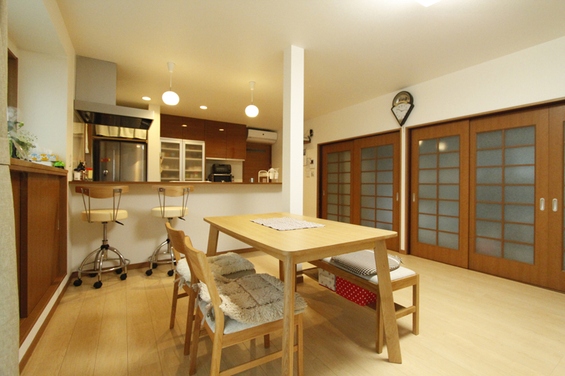 長年お使いになられたタイル張りのお風呂を綺麗にしたいことと、ダイニングと和室を繋げて広いLDKにすること。以前はキッチンのシンクとコンロが少し離れており、使い勝手が悪かったのでキッチンを使いやすくしたい。