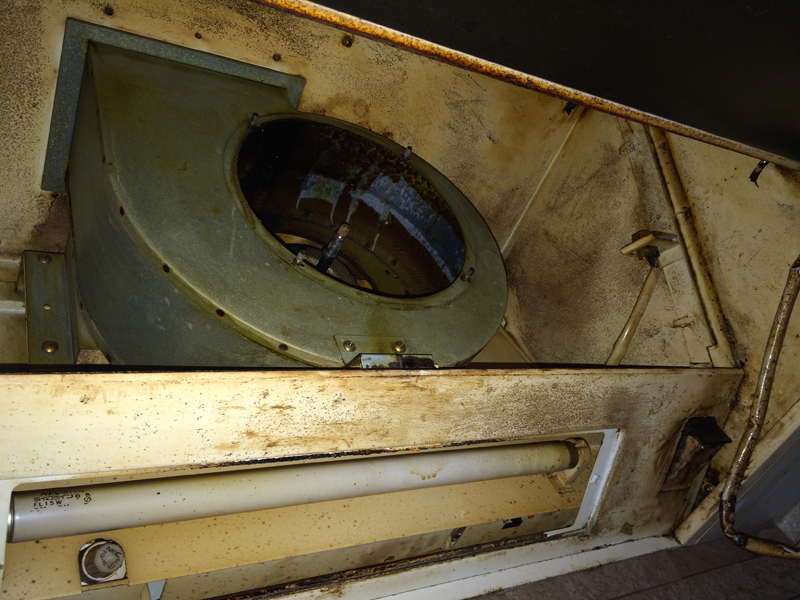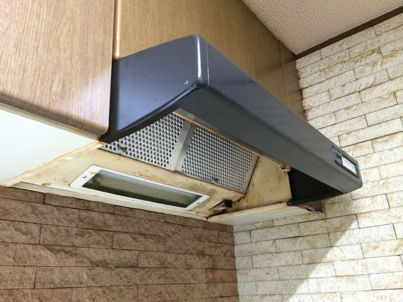 | 工事内容 | 外せる箇所全て外して洗剤で洗っていきます。また、レンジフード自体はこすって汚れを取ろうとすると塗装が剥がれる可能性があるので拭くように汚れを落としていきます。ファンの中も20年近く置いておくと油が固まってしまって洗剤をつけても落ないので、道具を使いながらコベリ付いた油を落としていきます。 |
