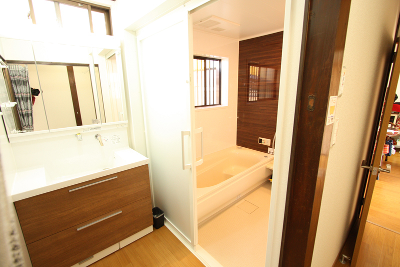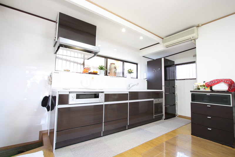 | 工事内容 | 水廻り(キッチン/バス/洗面台/トイレ)交換 床の上貼り クロス貼り替え 建具新調。 当初は内装工事のみの予定でしたが、床下を点検した所、白蟻の被害と浴室からの漏水が判明!水廻りを交換することになりました。元のお風呂は横幅は広いのですが奥行きがなかった為にご主人さまこだわりの1717サイズのシステムバスを設置するためにキッチンの壁を解体し壁を移動することで解決しました。キッチンは奥様こだわりのタカラのシステムキッチンを設置、各床を補強も兼ねてフローリングを上貼りし、新しい床に合わせて壁のクロスと各ドアを新調しました |