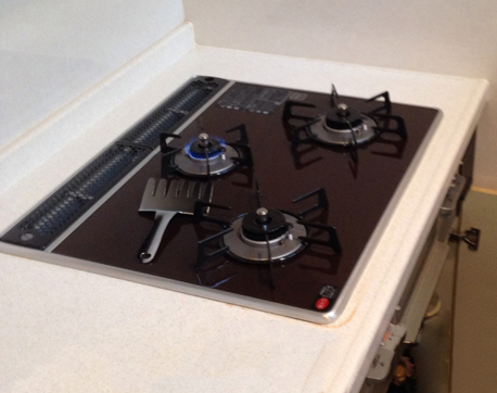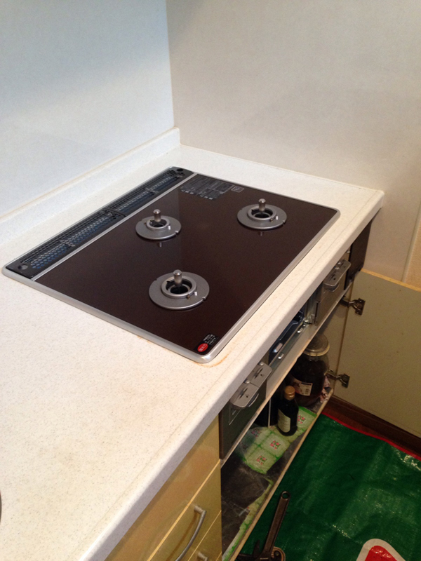 | 工事内容 | キッチンがシステムキッチンでしたので、交換工事は簡単でした。既存のガスコンロをスポっと抜いて、新しい ガスコンロをはめ込みました。ガスコンロを撤去した後は普段での掃除で、手の届かない場所をきれいにさせて 頂きました。設置後は微調整を行い、3口共着火するのか確認。もちろん、グリルも点火確認を行います。 着火の確認がOKでしたら工事完了です!! |