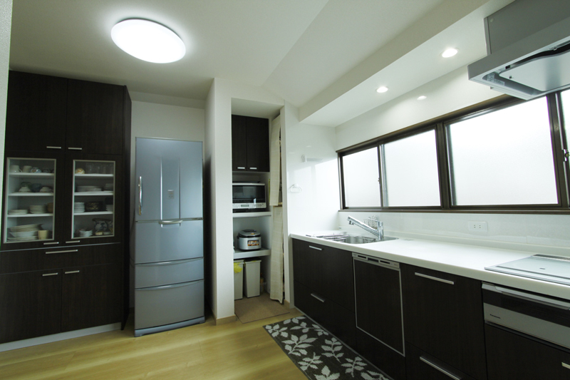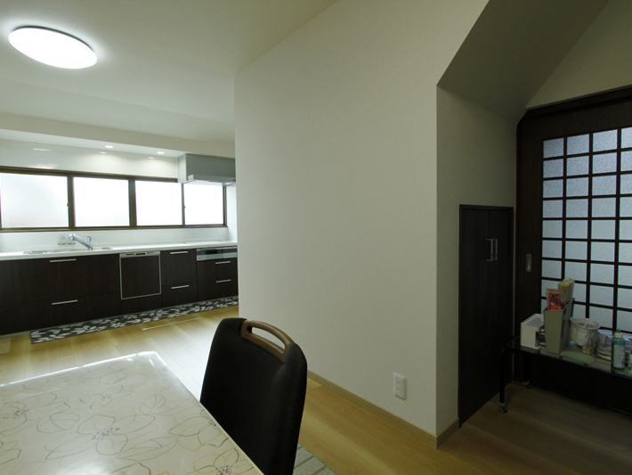 建物を一部増築して、お風呂を1坪サイズに。入口も引き戸仕様なのでのびのびゆったり入っていただきます。階段はリビングから場所を移動させ、ホールから上がるようにし寒さを解消しました。DKは家電収納、冷蔵庫、食器棚をキッチンの近くに配列して使い勝手よくなりました。 |