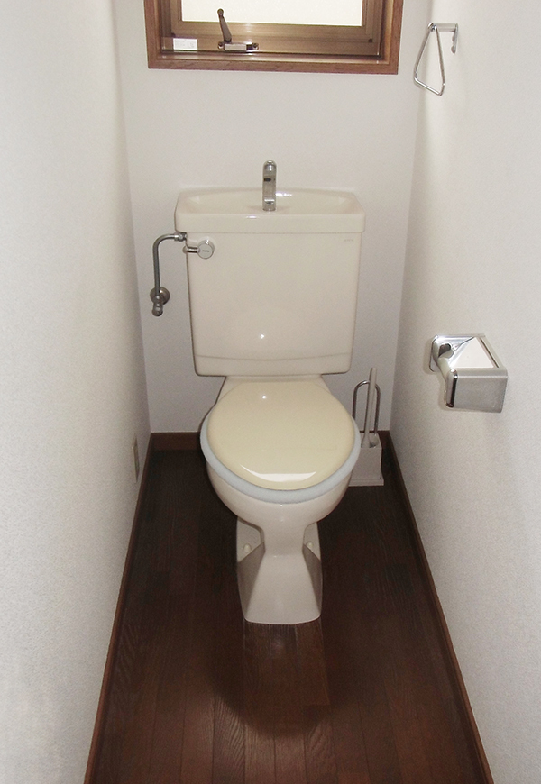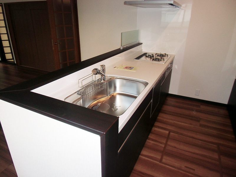 | 工事内容 | 取れるかどうかの壁に関して、天井裏から覗き、構造上のものではないことが判明したので、撤去しました。 キッチンは対面式で、後ろにカップボードを設置しました。また、LDKを広い空間にしたことで開放的にしました。 その他、風呂・洗面・トイレも入れ替えました。トイレの紙巻器やタオルリングはアンティーク調なもので仕上げています。 |