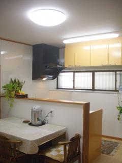 8帖のダイニング・キッチンも隣の和室(リフォーム前)と繋げて16帖のLDKになりました。部屋が大きくなったので、照明のスイッチ、コンセントの位置など考慮しました。今回のリフォーム工事はご近所さんでお友達のK様と共に楽しく仕事をさせて頂きました。ありがとうございました。