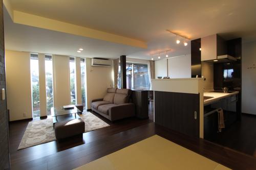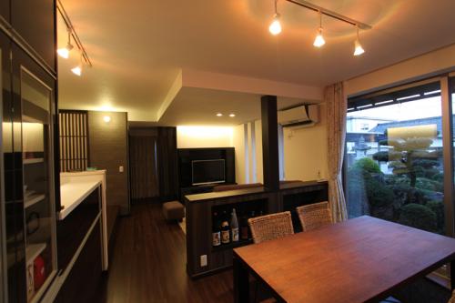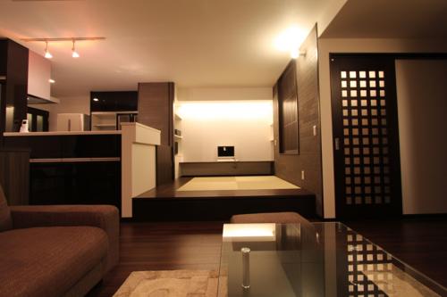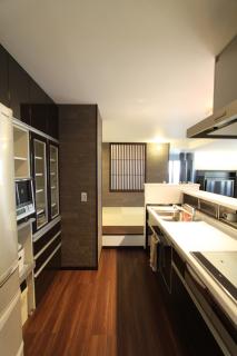 | 工事内容 | 離れの和室2間をLDKに。廊下にお風呂、洗面所。別棟に寝室を作り、連絡通路にトイレを設けるという大規模リフォームです。外観は腰までを杉板の鎧張りにし、上部に漆喰をぬり重厚感を演出。もともとの建物のイメージを余り崩さないように意識しました。内部のデザインは外部の和に調和するよう、落ち着いたウォルナット色をベースに和と洋のバランスを重視しプランしました。遊び心で作ったキッチンから畳コーナーの建具が、デザイン的にも機能的にも大きな効果を発揮しました。 |