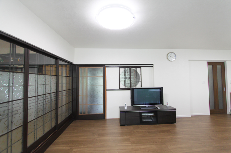 | 工事内容 | 間取りとしてあまり大きく変えず、お手持ちの家具の配置もプランの名kに取り込み、広々としたリビングに出来上がりました。床は濃い色で重厚感をだし、天井・壁は真っ白に仕上げたことで、奥様のこだわりのキッチンも一段と際立っております。 |