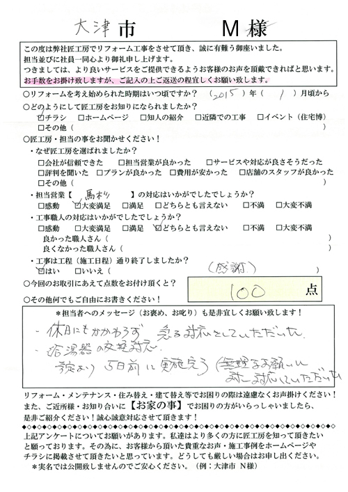 工事ご依頼頂き誠にありがとうございました。給湯器が使えないとご連絡頂いた後、運よく早めに施工させて頂く事が出来、本当に良かったです。これからもよろしくお願い致します。