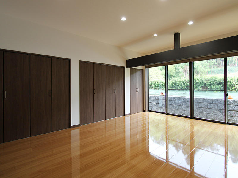 光沢のあるフローリングに外の景色やダウンライトが反射し、とても明るく広く見えますね!