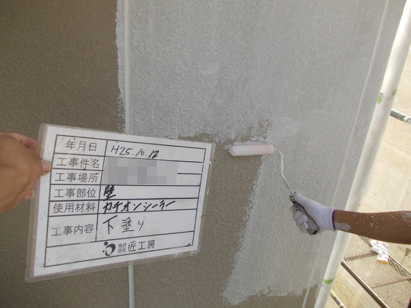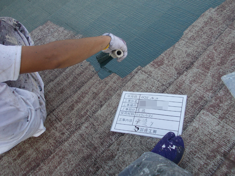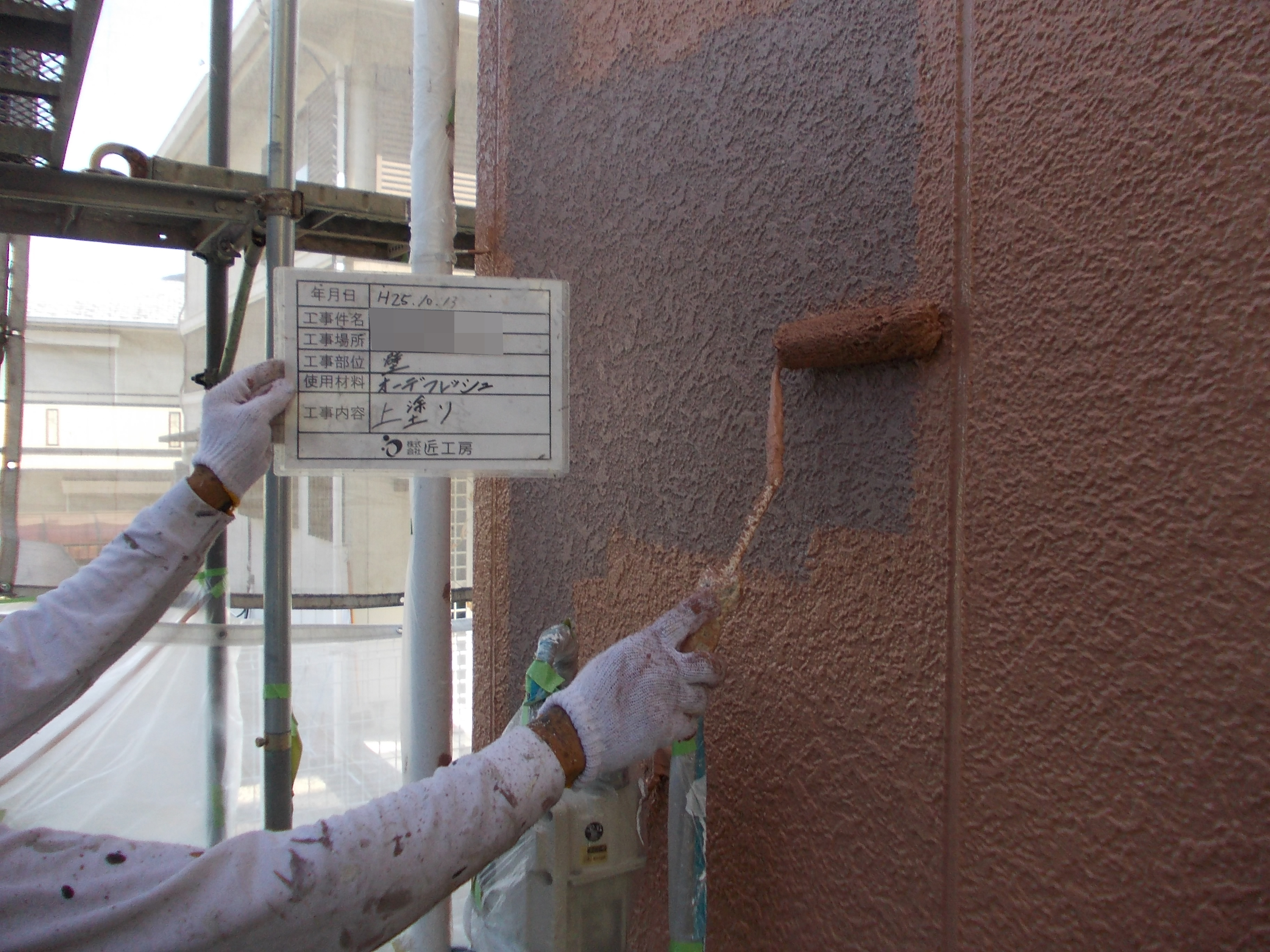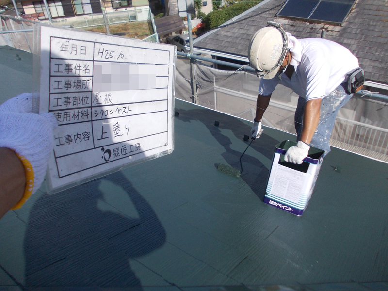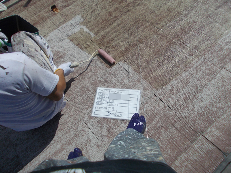 | 工事内容 | チョーキング現象や屋根の色あせ、コケ等の現象が発生していたので、バイオ洗浄でしっかり汚れを落とし、ハウスメーカー専用の下地材を塗布していきました。またコーキングの劣化が見受けられたので、サッシ廻りを含め、コーキングを打ち替えました。 |