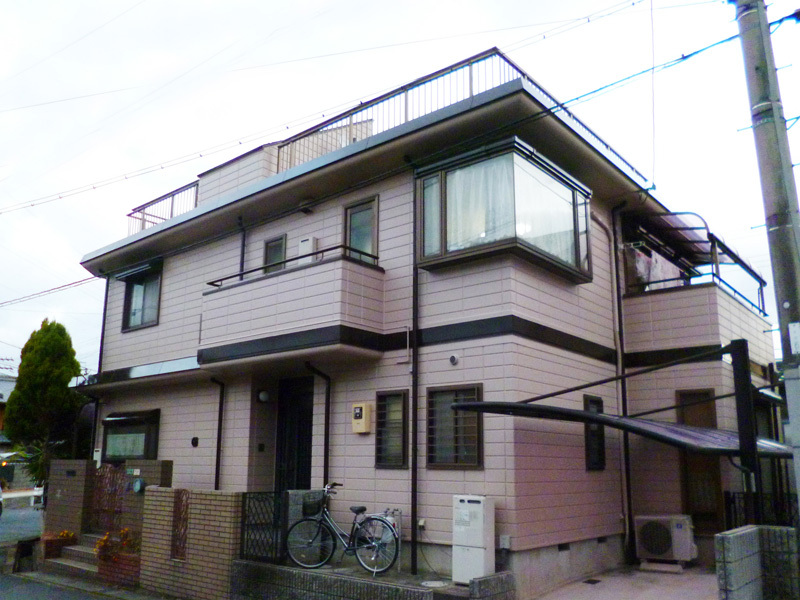 | 工事内容 | 築20年、初めての外装メンテナンスというこうで既存の外壁は、劣化症状の「チョーキング現象」や「クラック現象」が随所に見られました。これらを高圧洗浄やコーキング工事などでしっかりと下地処理したあとに、耐久性に優れている「スーパームキコート」を塗装していきました。もちろん塗装は下塗り・中塗り・上塗りの3回塗りです。また屋上の塔屋屋根は劣化が激しく塗装できる状態ではなかったので、「断熱トップ8-1」という鋼製屋根材をカバー工法で施工しました。 |