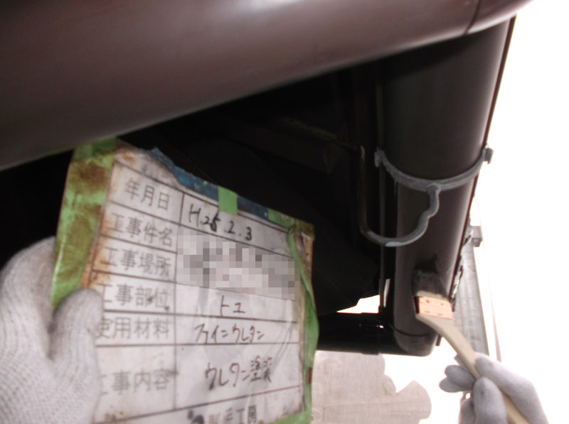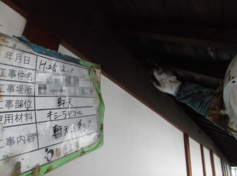 | 工事内容 | 足場をかけて、雪止め瓦に差し替えをしました。そして、今回木部が多いので、しっかりとひとつずつ刷り込むように塗装を加えております。焼き板は雨や紫外線によって、部分的に色が薄くなっていたり、あまり進行していない部分もありましたが、今回浸み込ませるキシラデコールという塗装を選択しております。これは木目を出すと いうメリットがあります。化粧垂木も一本一本丁寧に刷毛で塗りました。同様に化粧軒天も塗装しております。 |
