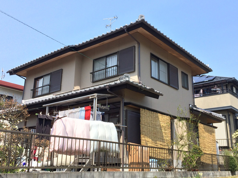 | 工事内容 | オリバークリーナーを使用し、外壁の洗浄を行い、シリコンの半艶を塗装しました。樋も一部外れているところがあったので、新たに付けました。また、塗装の際換気口のなかに作られた蜂の巣を撤去しました。外壁の塗装に加え、樋・木部・雨戸も塗装しました。 |