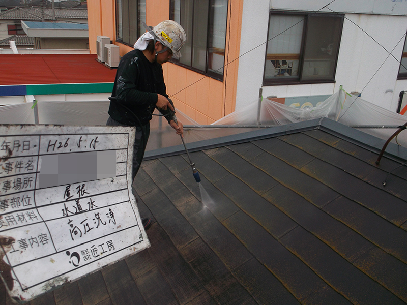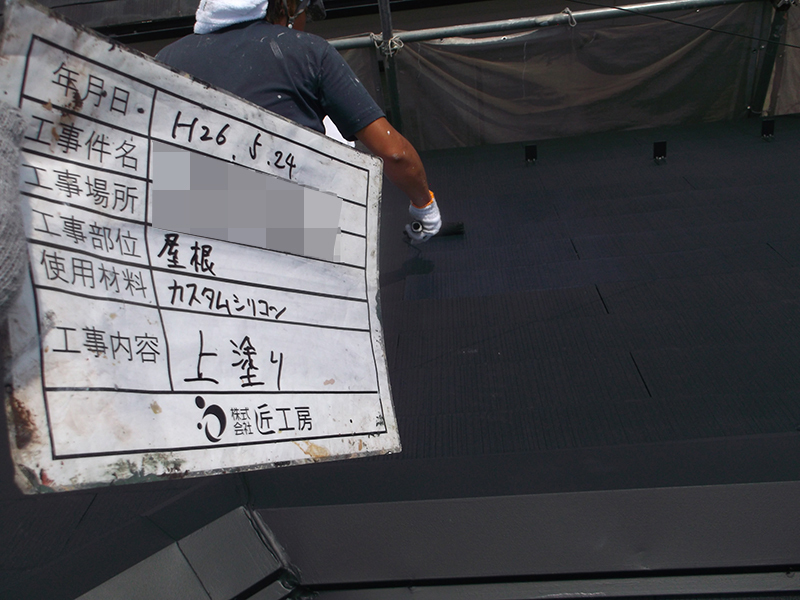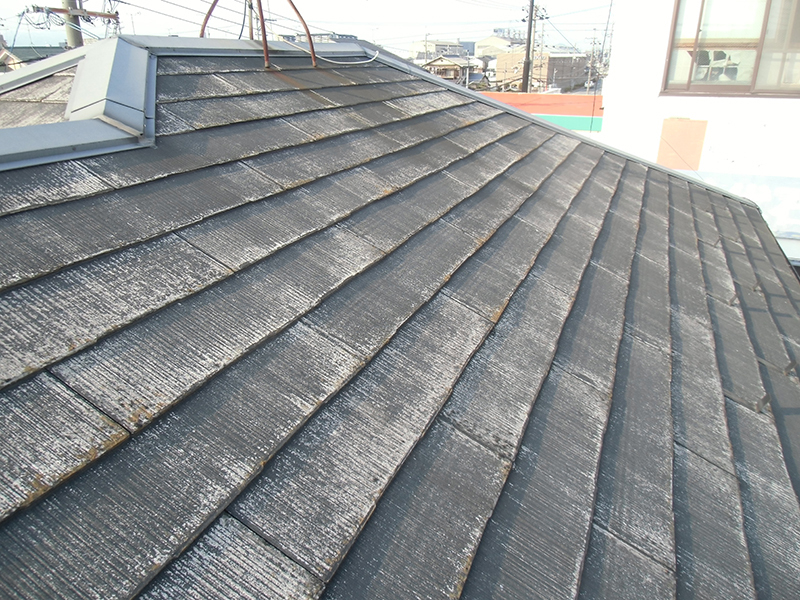 屋根は登ってみると、だいぶ塗膜劣化が進んでいました。