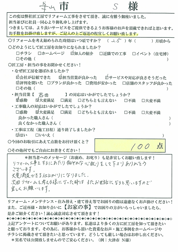 | 工事内容 | 屋根と外壁を高圧洗浄し、シリコン塗料で塗装しました。 外壁の目地部分のコーキングが劣化していたため、塗装を行う前に打ち替えをしました。 外壁の塗装に加え、樋・雨戸も塗装しました。 また、屋根にある不必要になったアンテナを撤去しました。 |