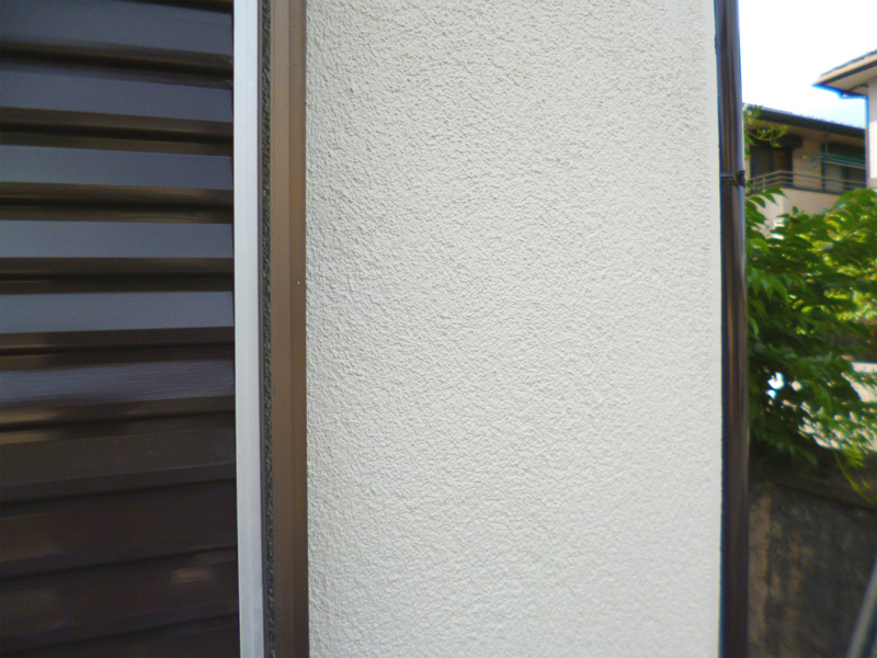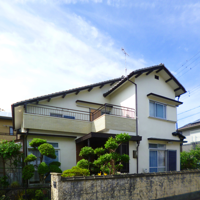 | 工事内容 | 築30年以上のお家で現状のが外壁仕上げが「モルタルリシンの掻き落とし」でした。外壁診断を行った結果、複数のひび割れと一部外壁の爆裂現象が確認できました。爆裂現象が起こっている壁はそのままでは塗装することはできないので、下処理として既存壁の撤去→左官による下地調整→周辺と同じ掻き落とし仕上げを施し、ひび割れが起きにくい弾性塗料の「SK化研のセラミクリーン」を塗装しました。また付随部分の雨戸、雨樋、玄関ドアも同じ色で塗装し統一感をだしました。 |