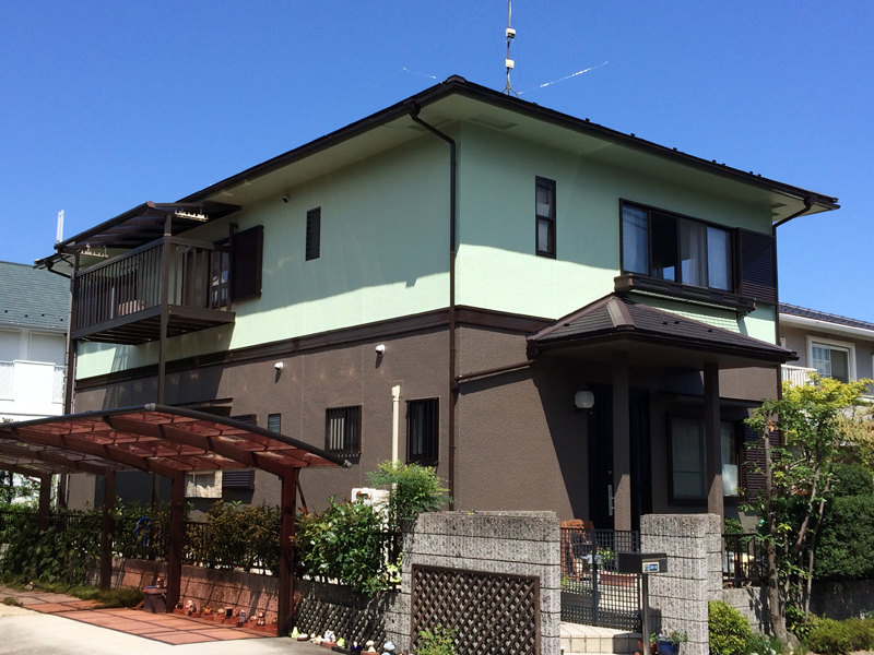 | 工事内容 | 屋根はまだ塗装出来る程度の劣化状況でしたが、屋根材自体の寿命や将来性のことも踏まえて、ケミューの「レイシャス・グラッサ」という耐久性があり、なおかつ意匠性の高いカラーベストを選ばれました。また、2階があついというお悩みが少しでも緩和できるように、葺き替えのタイミングで屋根裏に通気が出来るような「棟換気」を3本取り付けました。 外壁は耐久性のあるシリコン塗料を選ばれ、お家の上の部分と下の部分を違う色で塗り分けました。 |