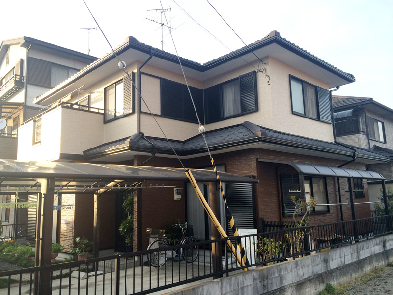 | 工事内容 | 今回のお客様の外壁はサイディングでしたので、シーラーを使い下地処理を行いました。 塗料はシリコン塗料を使い3回塗りをしました。 樋、雨戸などの細部には黒の2液ウレタン塗料を使用しました。 1階部分と2階部分の色を変えてツートーンにしました。 |