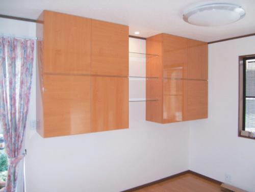 リビングの壁には家具職人による手造りの棚を設置。ガラス棚の部分にはダウンライトから優しい光を照らします。